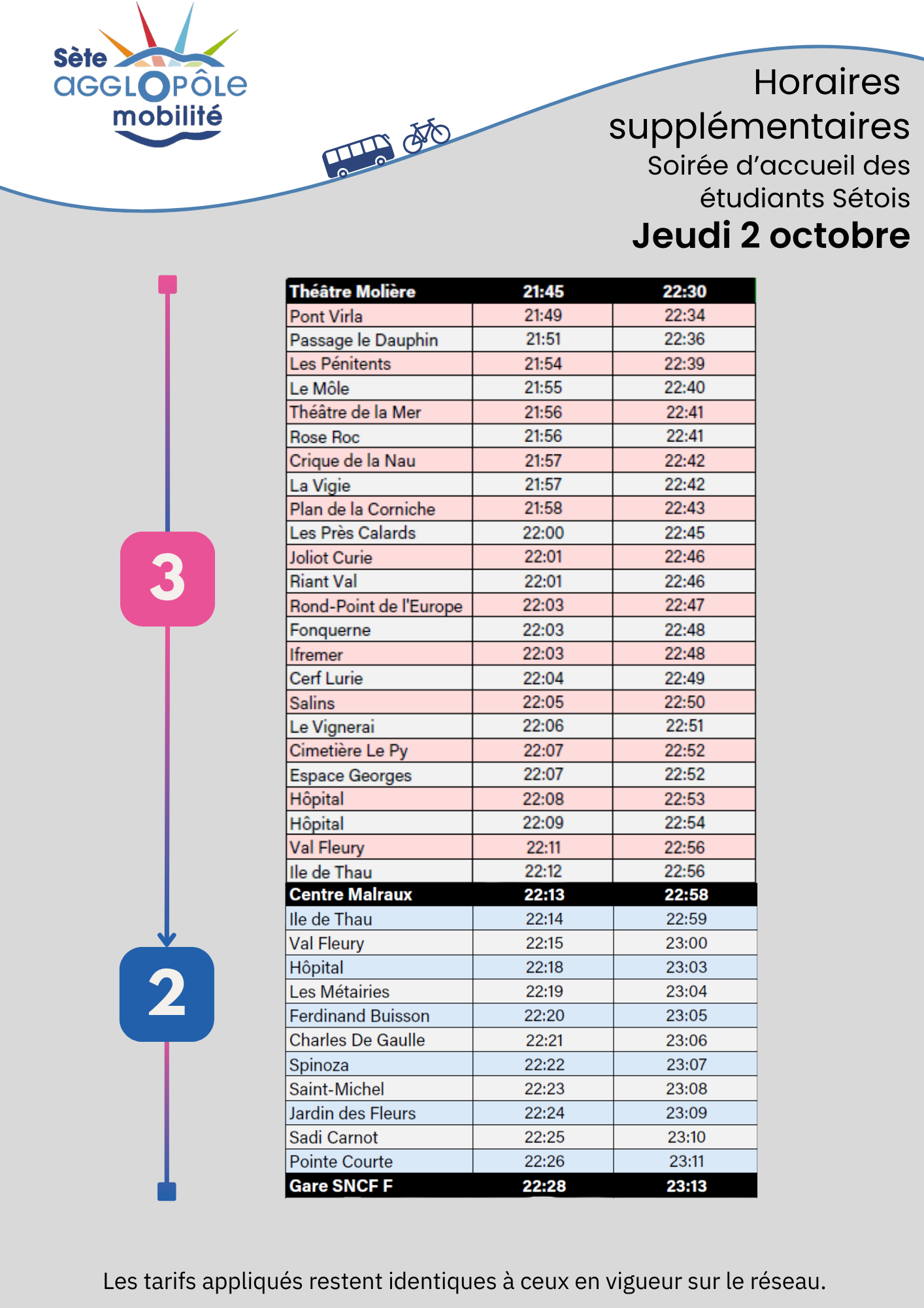 Dans le cadre de l’accueil des nouveaux étudiants sétois au Pôle universitaire Michèle Weil, les lignes 2 et 3 du réseau urbain bénéficieront d'horaires supplémentaires ce jeudi soir.